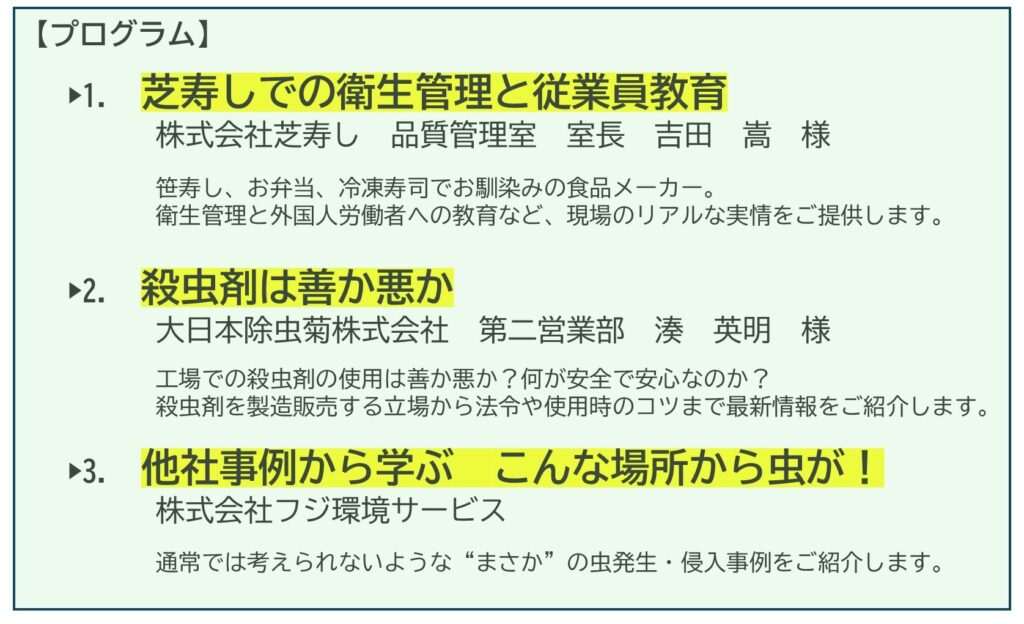 株式会社芝寿し様と大日本除虫菊株式会社様のご協力により、普段聞くことができない貴重な情報が満載のセミナーを企画することができました。
